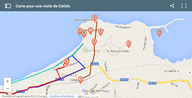 Comme le montre la carte ci-dessus, la gare de Cefalu (point n°1) se trouve dans une position assez centrale, à quelques centaines de mètres du centre historique et de la plage.