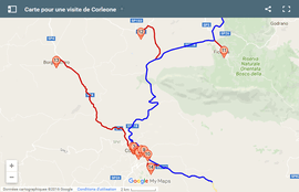 Corleone est située sur la route nationale SS118 (sur la carte : ligne bleue). La SS118 se sépare en deux au niveau de Bolognetta, entre Palerme et Agrigente (SS121/SS189). Depuis Palerme, comptez environ 45 minutes pour rejoindre Corleone. Depuis Agrigente, il faudra emprunter la SS118.