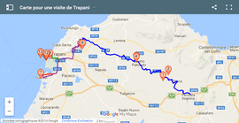 Si vous voulez surtout visiter Trapani et les marais salants, suivez la ligne violette jusqu'au Musée du sel. Faites attention : en raison d'une route à sens unique, le retour se fait différemment que l'aller (ligne rouge).