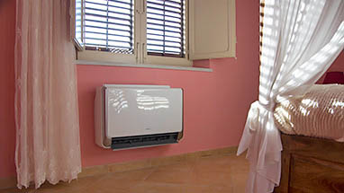 Il metodo di riscaldamento più diffuso in Sicilia è quello delle pompe di calore, che in estate possono essere utilizzate anche come condizionatori. Una variante può essere rappresentata da quello mostrato nella foto, a Casa Enza. Questi poggiano sul pavimento come normali termosifoni e, assieme all'aria, emettono un calore duraturo, una soluzione davvero comoda.