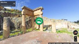 Sul pavimento della cosiddetta "Casa di Leda" gli archeologi hanno scoperto un mosaico che rappresenta una carta del cielo (Astrolabium). In questa foto panoramica si trova sotto al piccolo tetto (punto rosso 6 nella cartina):