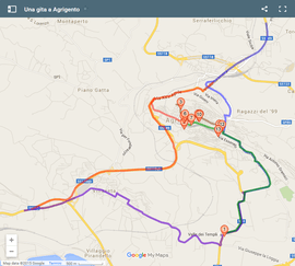 Purtroppo non è possibile raggiungere Agrigento servendosi dell'autostrada, per farlo dovrete perciò servirvi delle Strade Statali, la SS189 (linea blu) dalla Sicilia settentrionale e la SS115 (linea lilla) dalla parte occidentale, in direzione Agrigento ovviamente. Probabilmente la vostra prima destinazione sarà la Valle dei Templi, il cui parcheggio è contrassegnato dal punto 1.