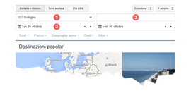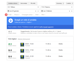 Una volta iniziata la ricerca, Google ci propone un aeroporto di partenza. Nel nostro esempio è quello di Bologna (punto rosso 1). Nel nostro esempio lo cambiamo con quello di Milano, di cui però non scegliamo l'aeroporto principale, ma quello di Bergamo. Come destinazione inseriamo l'aeroporto di Palermo (punto rosso 2).