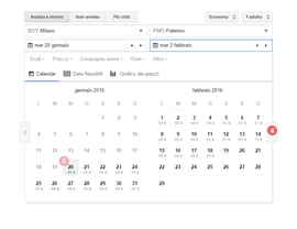 per ognuno dei giorni Google ci mostra il prezzo più basso che è riuscito a trovare. Il 20 è il giorno più economico di gennaio (punto rosso 5). Cliccandoci su il calendario cambia automaticamente. Come continuare lo chiariremo nella fase 3.