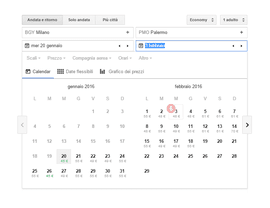 Cliccando nel campo "andata" (punto rosso 3) si apre una finestra con un calendario. Di questo parleremo nella fase 2.