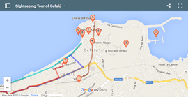 Cefalu is located close to the A20 motorway. The blue line at the top of the map shows the route from the motorway exit to a large car park next to the beach (marker 2). You can park your car here all day for a few euros.