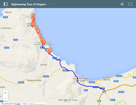 To get to the second place of real interest in Scopello you will pass right by the way to Zingaro. A great "watering hold" and the "Baglio" mark the spot (Marker 1). "Baglio" in Sicilian means feudal estate, in this case with buildings grouped around a central courtyard. Viewing the map in satellite mode, you can see the structure next to the marker very clearly. Today the Baglio di Scopello is a nice restaurant – making it perfect place to stop and refresh before our trip to the nature reserve.