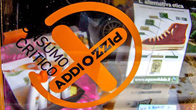 The media coverage was phenomenal the civil resistance against the Mafia became very strong. The young entrepreneurs who had thought of this scheme founded the anti-protection-money initiative called "Addiopizzo". The picture above shows an Addiopizzo sticker in the window of a shop. When you spend your money in these shops, you can be fairly sure your holiday spending money will not end up in the pockets of the Mafia.