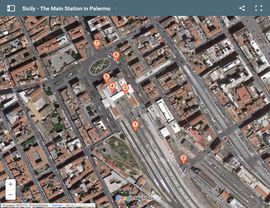 In the map below, you can see a sun icon right next to the red marker 2. Zoom in at this point and click the little "Earth" window on the bottom left of the map. You will end up at the train station in the small town of Santa Flavia.