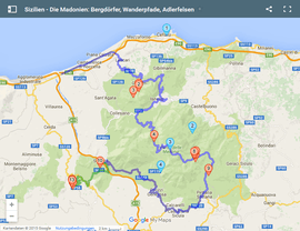 In der Karte oben ist diese Tour blau markiert. In Gratteri (rote Marker 1, 2 und 3), Scillato (roter Marker 10) und Sclafani Bagni (rote Marker 11 bis 13) schlagen wir kurze Abstecher vor. Diese Abstecher sind durch grüne Linien markiert. Bitte zoomen Sie die Karte um diese Marker herum, um mehr Details zu sehen.