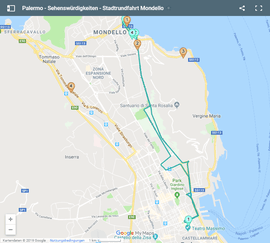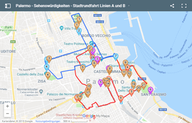 Daher hat sich der Anbieter der Stadtrundfahrten entschlossen, eine spezielle Bus-Linie nach Mondello einzurichten. Sie startet beim grünen Marker 1 in Karte oben und endet bei Marker 4 in der Karte unten. Am Startpunkt befindet sich auch Haltestelle die gemeinsame Haltestelle 1 von Linie A und B. Hier können Sie also problemlos von einer in die andere Linie wechseln. Die Fahrt dauert ca. eine Stunde.