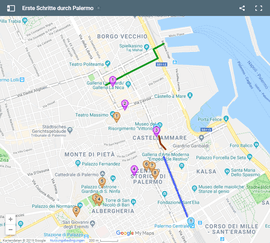 Viele der Sehenswürdigkeiten Palermos - besonders in der Altstadt - können Sie problemlos zu Fuss entdecken. Die Karte unten zeigt, wie dicht beieinander sie liegen. Haben Sie eine Ferienwohnung in der Altstadt gemietet, liegen Ihnen also die Sehenswürdigkeiten zu Füssen.