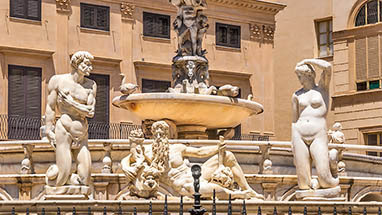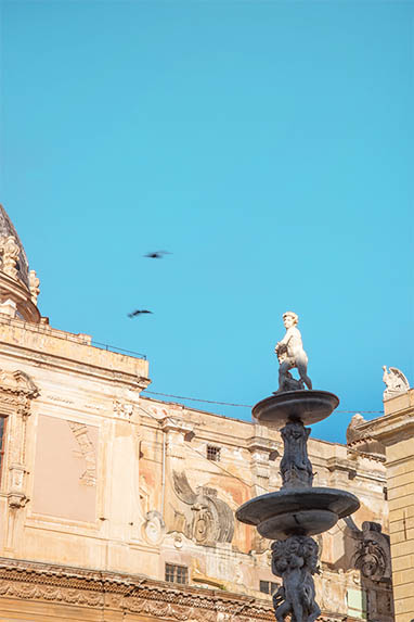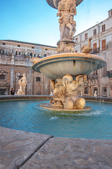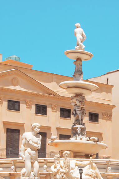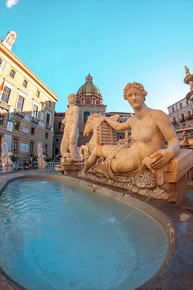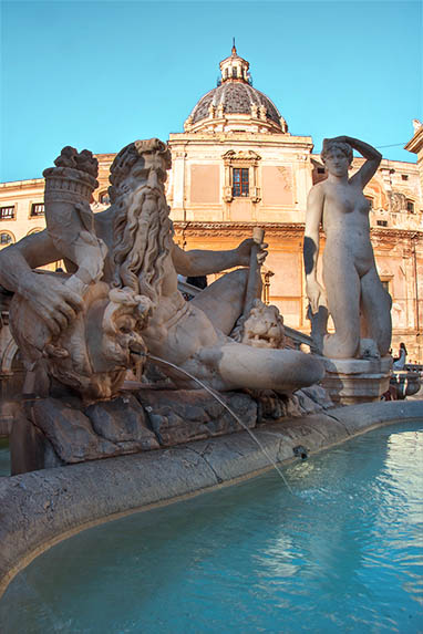 Eines der umstrittensten Sehenswürdigkeiten Palermos ist die gut 400 Jahre alte Fontana Pretoria (Karte). Der Volksmund spricht vom "Brunnen der Sünde" - oder besser sprach. Aus heutiger Sicht mag man die Fontana Pretoria vielleicht als kitschig beschreiben. Jeder Zeitungskiosk ist heutzutage "sündiger" als dieser Brunnen.