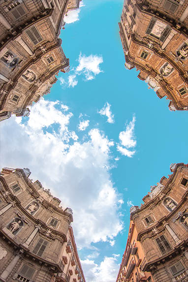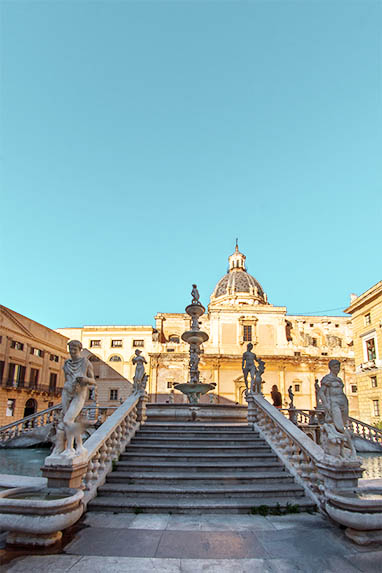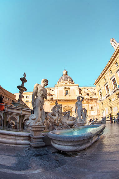 In direkter Nachbarschaft des "Brunnens der Schande" (Fontana Pretoria) liegt die zentrale Sehenswürdigkeit der Altstadt Palermos - die Kreuzung Quattro Canti (Karte).
