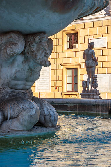 Die Bürger früherer Zeiten empörte zwei Dinge: Zum einen zeigt der Brunnen Figuren aus der antiken Mythologie (wie z.B. Bacchus, also eine eher lebenslustige Gottheit) und nicht brave katholische Heilige. Zu allem Überfluss sind die Figuren dann auch noch nackt. Etwas holzschnittartig zusammengefasst repräsentiert die Fontana Pretoria also das "Sex and Drugs and Rock and Roll" der Renaissance.