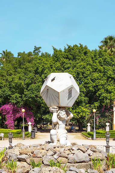 Die Sonnenuhr steht genau in der Mitte der Villa Giulia und besteht aus einem 12-seitigen Marmorblock. Getragen wird dieser Block von einem jungen Atlas, also dem Titan aus der griechischen Mythologie, der die Himmelskugel trug. Angesichts des zumeist guten Wetters können Sizilien-Urlauber diese Sonnenuhr sogar nutzen.