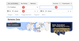 Mit einem Klick in das Feld Hinflug (roter Marker 3) öffnet sich ein Kalender. Wir erklären ihn in Schritt 2.