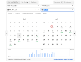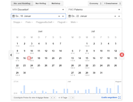 Da unser Sizilien Urlaub aber genau 2 Wochen lang sein soll, nehmen wir als Rückflug den 1. Juli (roter Marker 6). Mit 70 € ist auch dieser Flug in den Sizilien Urlaub immer noch sehr günstig.