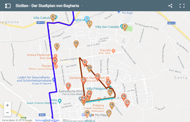 Die Gemeinde Bagheria (rote Marker 1 bis 3) ist nur eine der versteckten Perlen am Fusse des Naturschutzgebietes Monte Catalfano (grüner Marker 1).