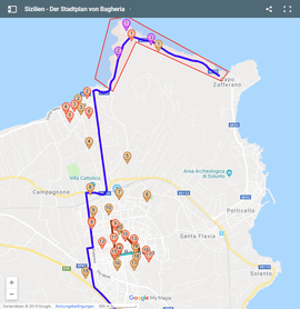 Fünf weitere sind das Fischerdorf Sant'Elia (blauer Marker 5), die wunderbare Bucht Borgo di Santa Nicolicchia (blauer Marker 4), der Fischereihafen Porticello (blauer Marker 3) und das ehemalige Schloss Solanto (blauer Marker 1). Sie sind alle Ortsteile der Gemeinde Santa Flavia (blauer Marker 1). Hier können Sie ein paar wunderbare Ferienwohnugen im Ortskern mieten - und für jeden Geldbeutel ist etwas dabei.