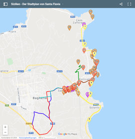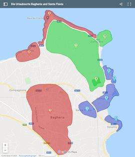 Die Gemeinde Santa Flavia (blaue Marker 1 bis 5) ist nur eine der versteckten Perlen am Fusse des Naturschutzgebietes Monte Catalfano (grüner Marker 1).